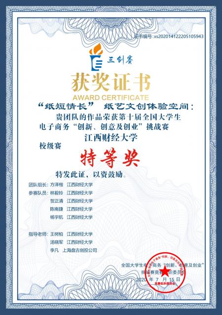近日,第十届全国大学生电子商务“创新、创意及创业”挑战赛江西赛区省级选拔赛在我校隆重举行。在经过激烈的角逐后,金沙 《“纸短情长”纸艺文创体验空间》项目荣获校级特等奖第一名(冠军)、省级特等奖第一名(冠军)晋级国赛。