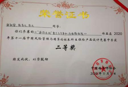 11月6日-8日,第十一届中国风险管理与精算论坛在厦门大学举行,在论坛举办的本科生保险产品设计竞赛中,我校统计学院林耿堃、陈易凡、危凡同学的参赛作品《“逆行无忧”重大公共事件人员保障保险》和李影、鲍莉洁、杜雨含同学的参赛作品《“安然无忧买房险”——如期交房保障保险》分别获得本科生组二等奖和三等奖。