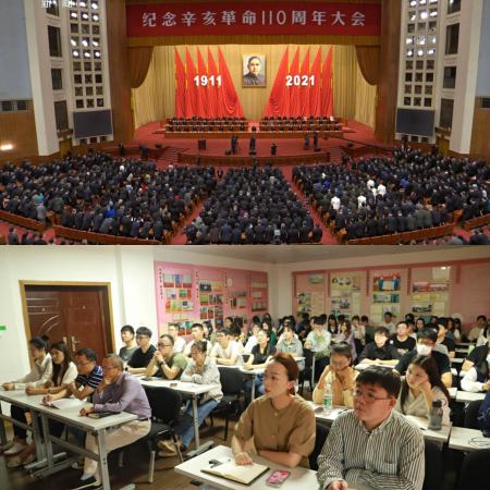 10月9日上午,统计学院于蛟桥园北区综合楼313会议室组织收看纪念辛亥革命110周年大会。学院党委书记陶春海,党委副书记黄黑平,院团委书记陈曦,辅导员钟晴、林阳、庄园及研究生和本科生党员、本科生团员代表一同参加收看。