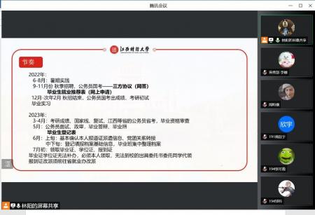 院团委书记陈曦在会上强调了第二课堂的重要性,提醒2023届同学及时关注第二课堂学分。就业专员林阳分析了当下就业形势,通报了2021届就业数据和2022届目前考研情况,就毕业资格审查、简历制作、心态调整、毕业就业手续办理、毕业季重要时间节点进行了说明。