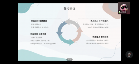 上岸湖南大学的杨晓霞向备考396专业课的同学们推荐了各科考研书目以及优秀老师的网络课程视频。与此同时,她还结合自身经历,在情绪管控和时间管理这一方面给同学们提出许多宝贵建议。